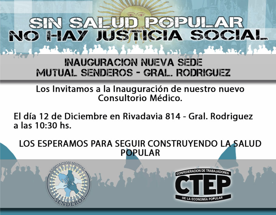 INAUGURACIÓN NUEVA SEDE EN GRAL. RODRIGUEZ por Gabriela BonusPublicado el 3 diciembre, 201422 julio, 2020Publicado en Novedades Los Invitamos a la Inauguración de nuestro nuevo Consultorio Médico. El día 12 de Diciembre en Rivadavia 814 – Gral. Rodriguez a las 10:30 hs. Los esperamos para seguir construyendo la salud Popular